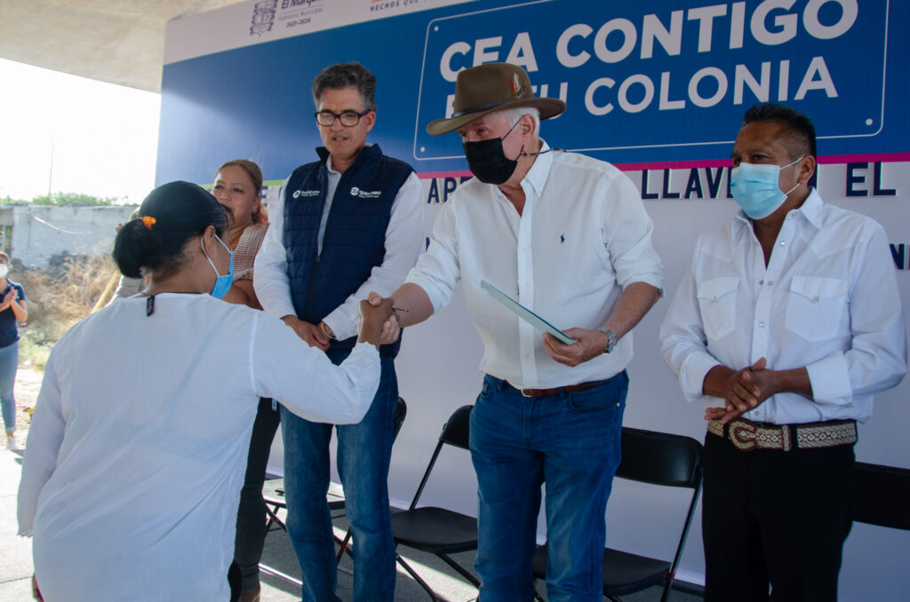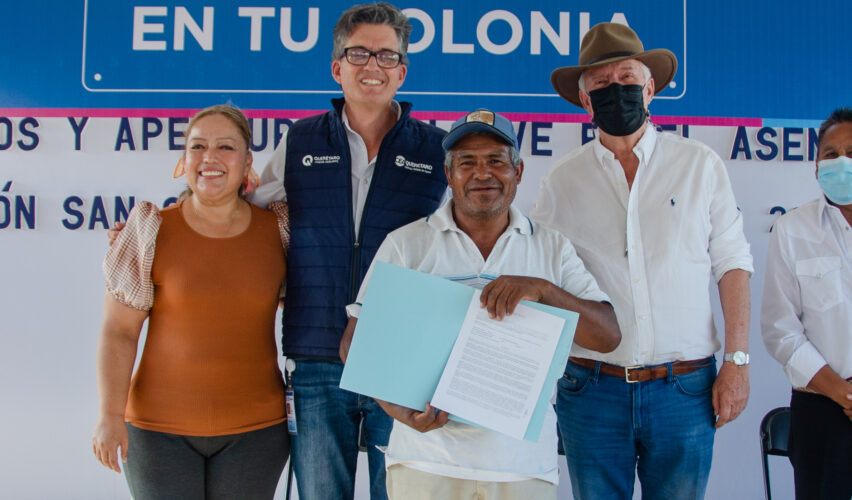El Marqués, Qro., 7 de junio de 2022.- El presidente municipal de El Marqués, Enrique Vega Carriles, acompañó al vocal ejecutivo de la Comisión Estatal de Aguas (CEA), Luis Alberto Vega Ricoy, durante la entrega de 296 contratos de servicio de agua potable en el asentamiento Ampliación San Cristóbal, ubicado en la delegación El Colorado.