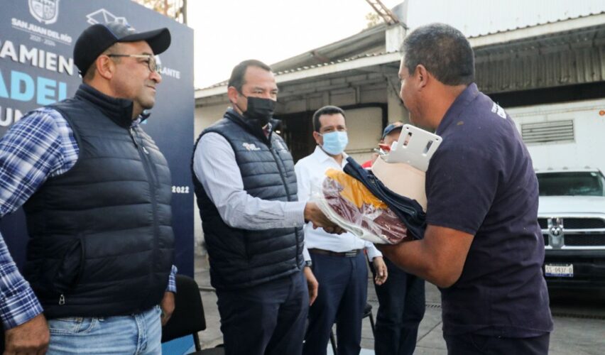 San Juan del Río, Qro., 8 de junio de 2022.- El presidente municipal de San Juan del Río, Roberto Cabrera Valencia, entregó indumentaria y equipo en el rastro local, ubicado en el norponiente de la ciudad.