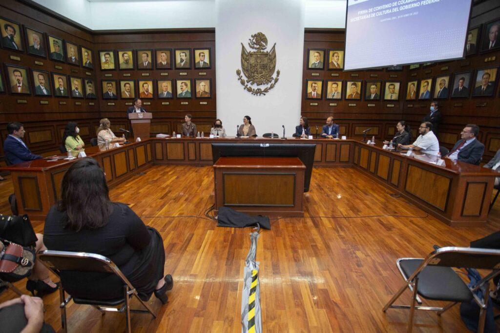 Querétaro, Qro., 10 de junio de 2022.- En la reunión regional de Cultura Zona Centro Occidente, que tiene sede en Querétaro, el gobernador Mauricio Kuri firmó un convenio con la Secretaría de Cultura federal, el cual busca promover y difundir las expresiones artísticas y culturales de México, además de proyectar la imagen de la entidad en el país y el extranjero.