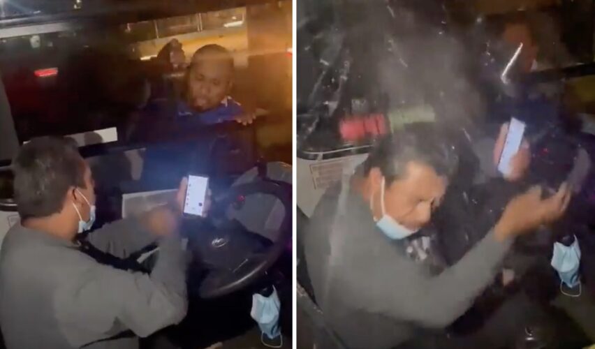 Un video grabado por pasajeros del camión que registra los hechos se compartió en redes sociales. En las imágenes aparece un sujeto con playera azul gritando y amenazando al conductor del camión con “reventarle los cristales” si no le paga.