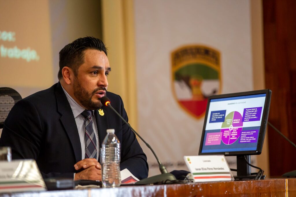 Pérez Hernández reportó los avances de la implementación de la política estatal de seguridad, materializados en la aprobación de la estrategia por el Consejo Estatal de Seguridad Pública, la publicación del Programa Estatal de Seguridad (PES), en los programas de seguridad de los 18 municipios alineados al PES y en la publicación del paquete de reformas legislativas y al código penal para sustentar los modelos.