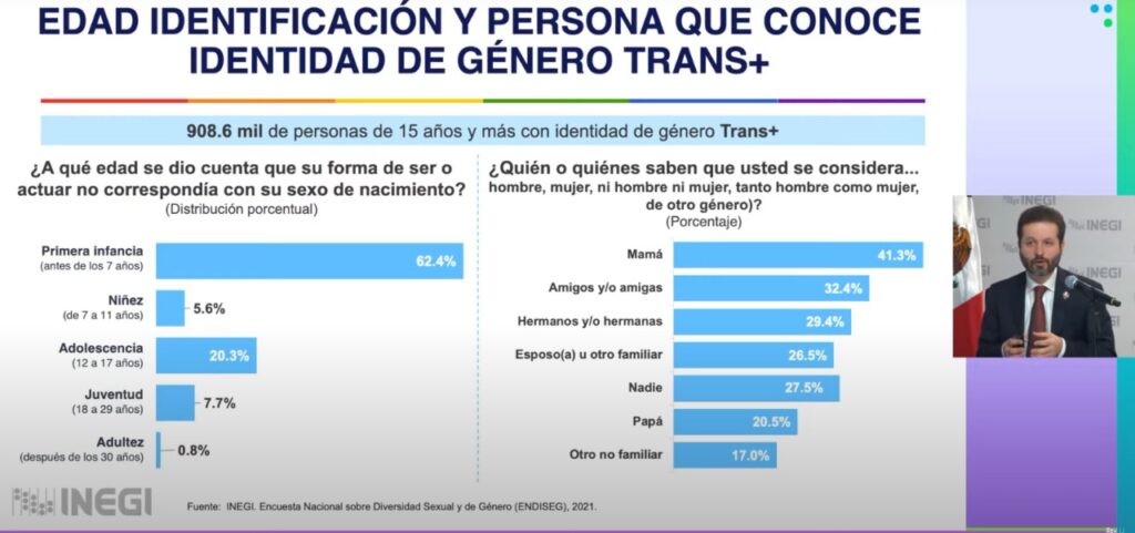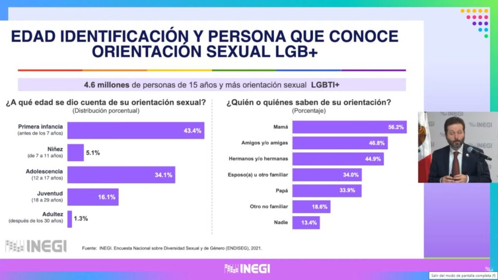 Sobre la edad de identificación de la persona que reconoce su orientación sexual LGB+, el 43.4 por ciento de la población se dio cuenta de su orientación sexual en la primera infancia, antes de los 7 años; el 34.1 por ciento durante la adolescencia, de 12 a 17 años, el 16.1 por ciento en su juventud, de los 18 a los 29 años; el 5.1 por ciento durante la niñez, de los 7 a los 11 años, y el 1.3 por ciento durante la adultez, después de los 30 años.