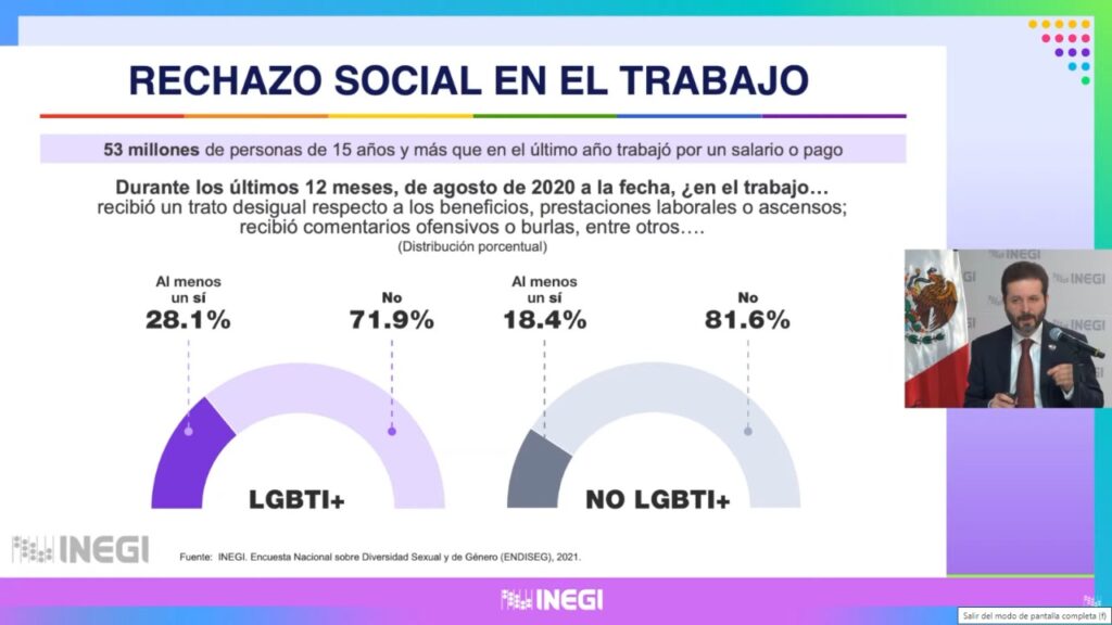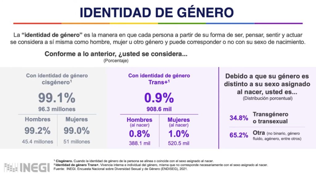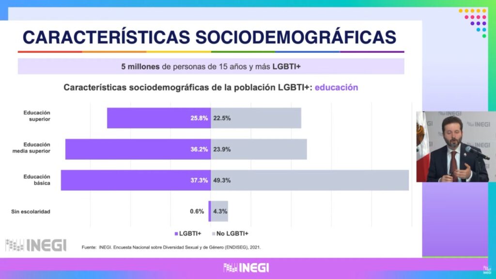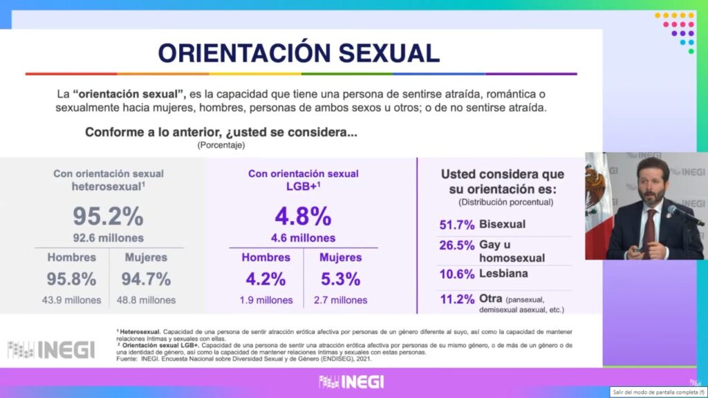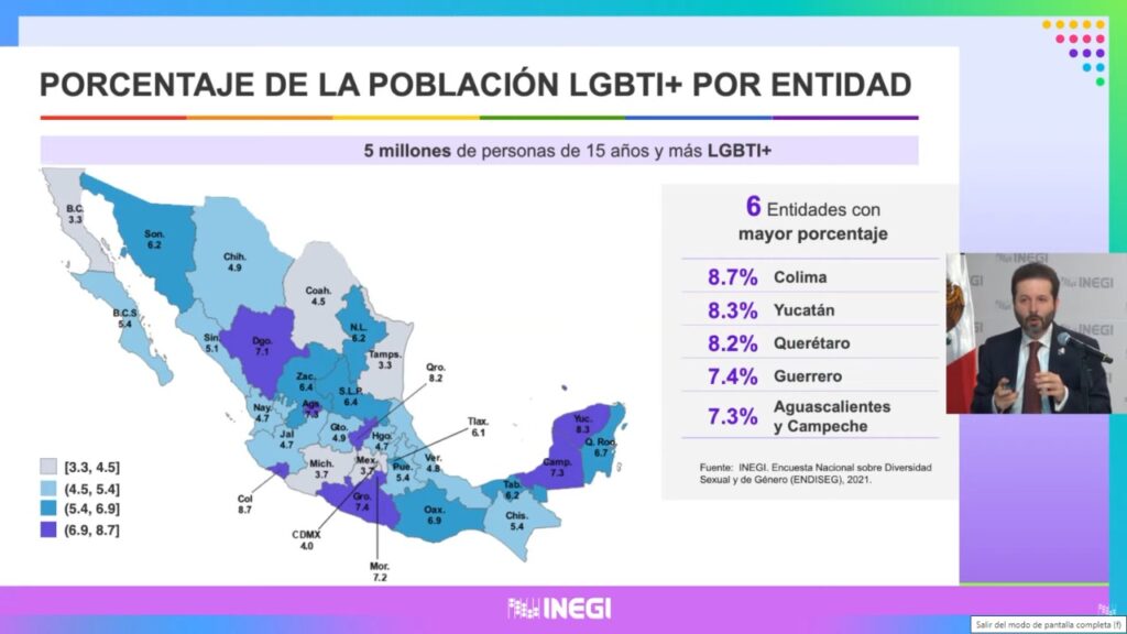 Al presentar la Encuesta Nacional sobre Diversidad Sexual y de Género 2021 del Inegi, Vielma Orozco detalló que una de cada 20 personas en el país se reconoce como población LGBTI+, lo que representa alrededor de 5 millones de personas, esto es el 5.1 por ciento de la población mexicana de 15 años y más.
