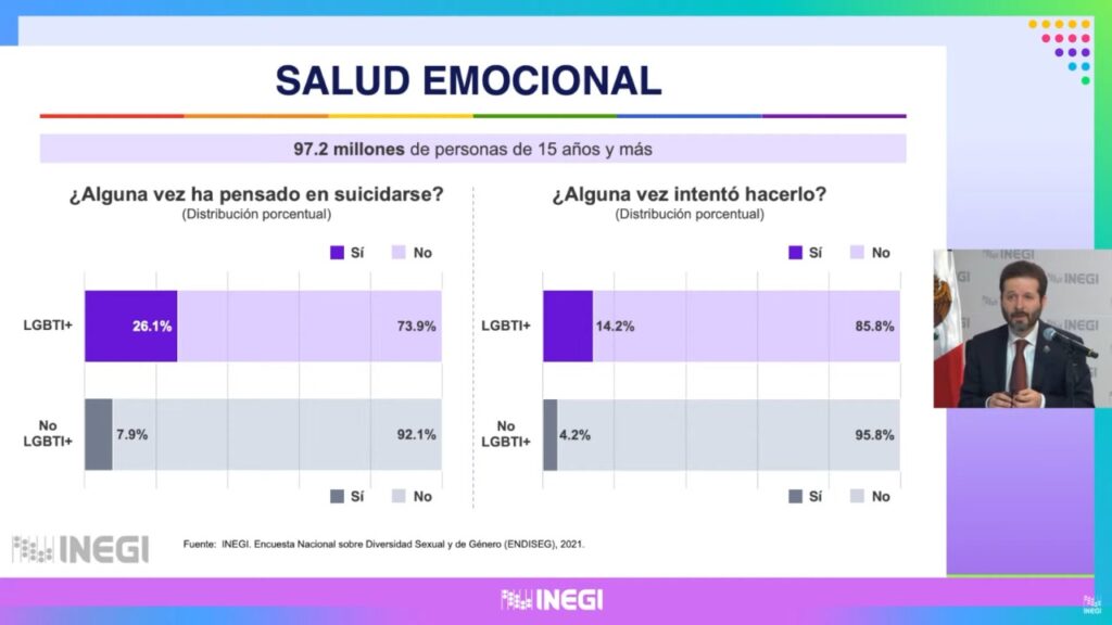Sobre la salud emocional, la encuesta del Inegi encontró que el 26.1 por ciento de la población LGBTI+ alguna vez pensó en suicidarse y el 14.2 por ciento alguna vez lo intentó.