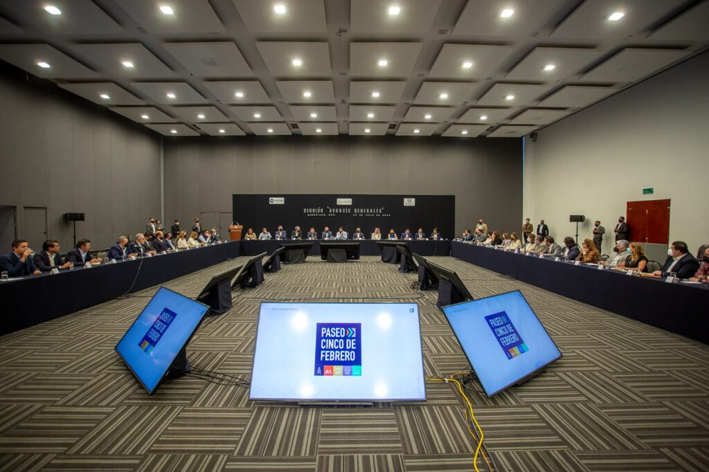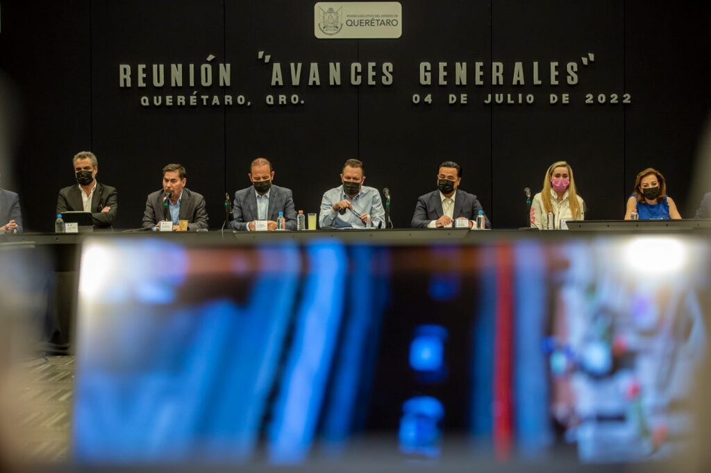 Querétaro, Qro., 4 de julio de 2022.- Los retos se enfrentan con decisión y valentía, aseveró el gobernador Mauricio Kuri durante una reunión con integrantes del gabinete estatal y con representantes del municipio de Querétaro; se trataron los avances generales de las obras y acciones del proyecto Paseo 5 de Febrero.