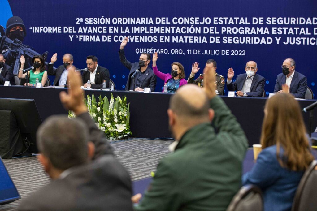 Querétaro, Qro., 11 de julio de 2022.- En la segunda sesión ordinaria del Consejo Estatal de Seguridad, el gobernador Mauricio Kuri aseguró que la seguridad de los queretanos es una tarea primordial y fundamental de su administración. Además, reconoció a los presentes por su dedicación al respecto.