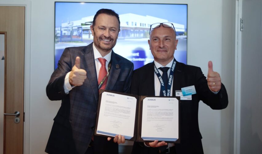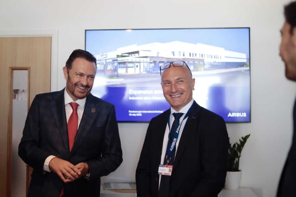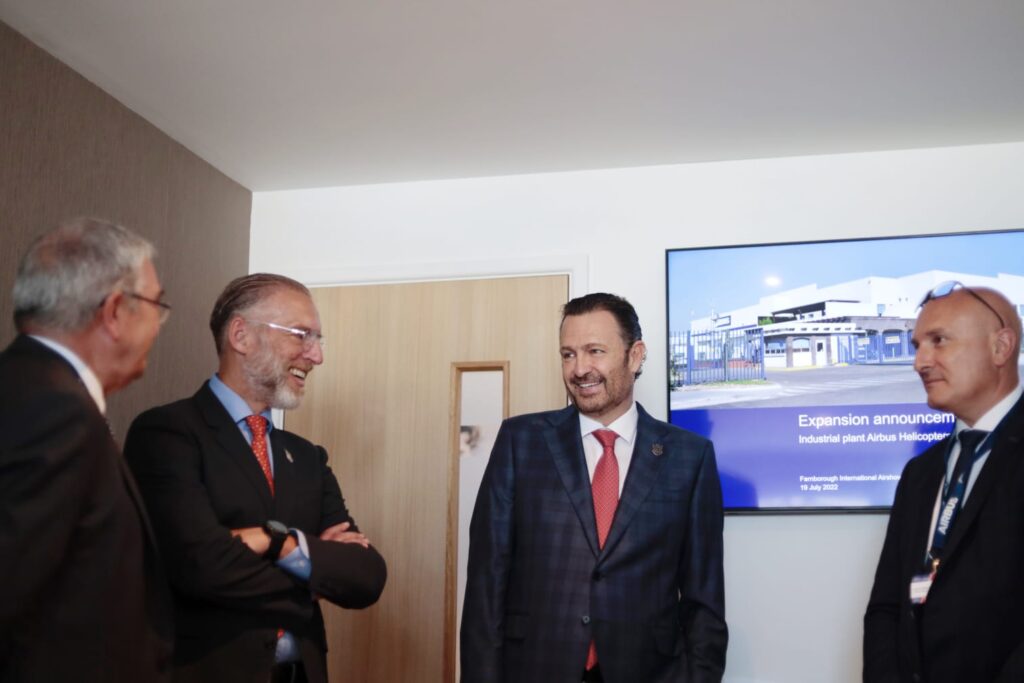 Londres, Reino Unido, 19 de julio de 2022.- El gobernador Mauricio Kuri, en su segundo día de gira en la Farnborough International Airshow, atestiguó la firma de un acuerdo de inversión con el vicepresidente ejecutivo de Operaciones de Airbus Helicopters, Laurent Mazoué, el cual concreta un proyecto de expansión de la planta de Colón por más de 409 millones de pesos.