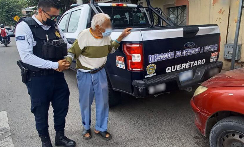 Querétaro, Qro., 20 de julio de 2022.- En atención a una solicitud de apoyo, policías de la Dirección de Atención a Víctimas de Violencia Familiar y de Género se trasladaron a inmediaciones del Centro Histórico de la ciudad, toda vez que se informó de una persona adulta mayor que se encontraba extraviada y no recordaba cómo regresar a su domicilio, y que además portaba un brazalete del programa “De la mano por tu seguridad”.