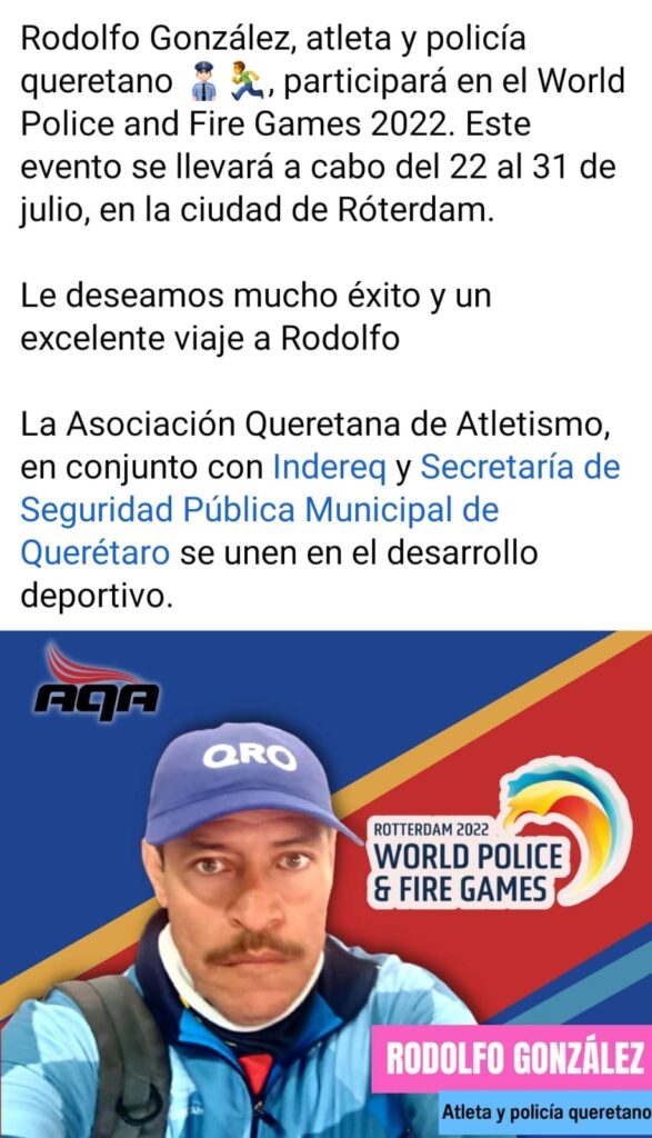 Querétaro, Qro., 20 de julio de 2022.- Rodolfo González Moreno, policía de la Secretaría de Seguridad Pública Municipal de Querétaro, participará en los Juegos Mundiales de Policías y Bomberos de Rotterdam 2022, en Países Bajos.