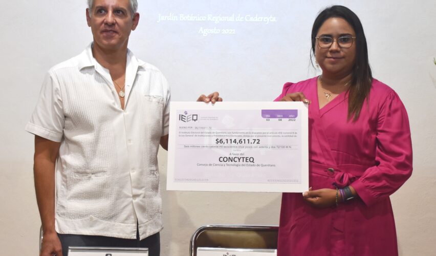 Querétaro, Qro., 4 de agosto de 2022.- Integrantes del Consejo General del Instituto Electoral del Estado de Querétaro (IEEQ) hicieron entrega de 6 millones 114 mil 611 pesos al Consejo de Ciencia y Tecnología del Estado de Querétaro (Concyteq), que serán destinados a diversos proyectos científicos y tecnológicos en beneficio de la población queretana.