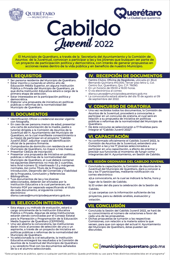 Querétaro, Qro., 17 de agosto de 2022.- La Comisión de Asuntos de la Juventud del Ayuntamiento de Querétaro invitó a las juventudes de la capital que cursen el último año de preparatoria y estén interesadas en temas políticos y sociales a formar parte del Cabildo Juvenil 2022, con el cual se busca impulsar propuestas, iniciativas e ideas frescas.