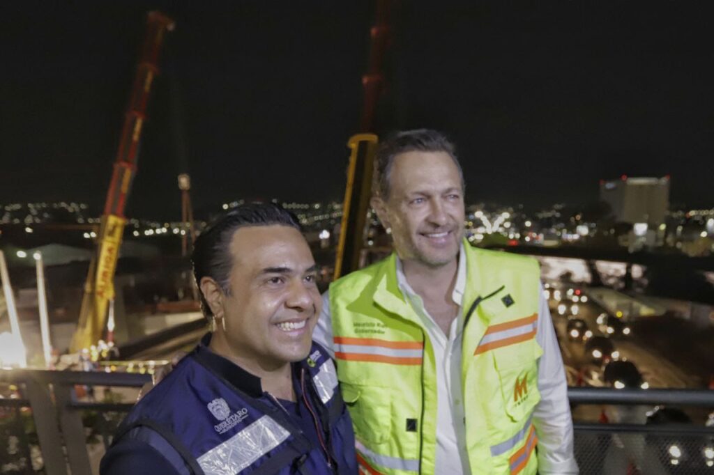 Querétaro, Qro., 21 de agosto de 2022.- El gobernador Mauricio Kuri supervisó los trabajos de construcción del Paso Superior Vehicular en la intersección del Boulevard Bernardo Quintana y Avenida Sombrerete, en el municipio de Querétaro, que cuentan con un avance superior al proyectado para esta fecha, pues se esperaba estar en 37 % y la obra va en 60 %. En la jornada de esta noche se colocó el cuarto tramo del puente.