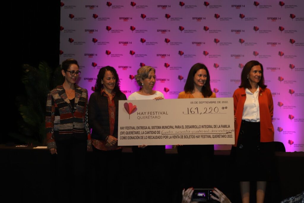 Asimismo, la organización del Hay Festival entregó a las autoridades municipales un cheque por 164 mil 220 pesos, como donativo para el DIF municipal; dicho monto se recaudó con la venta de boletos para los eventos.