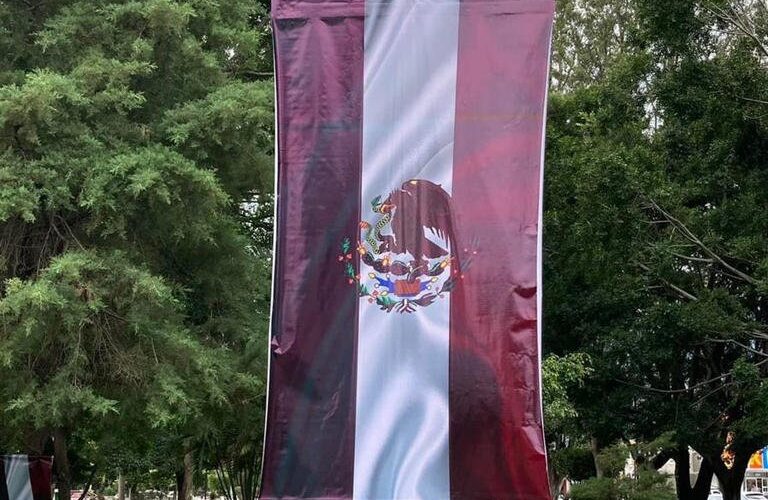 Tepic, Nay., 14 de septiembre de 2022.- El gobierno de Nayarit adornó los alrededores de la rotonda de los Niños Héroes y el monumento al Batallón de San Blas, en Tepic, con pendones de la bandera cuyos colores fueron alterados, utilizando el guinda en vez de verde y rojo.