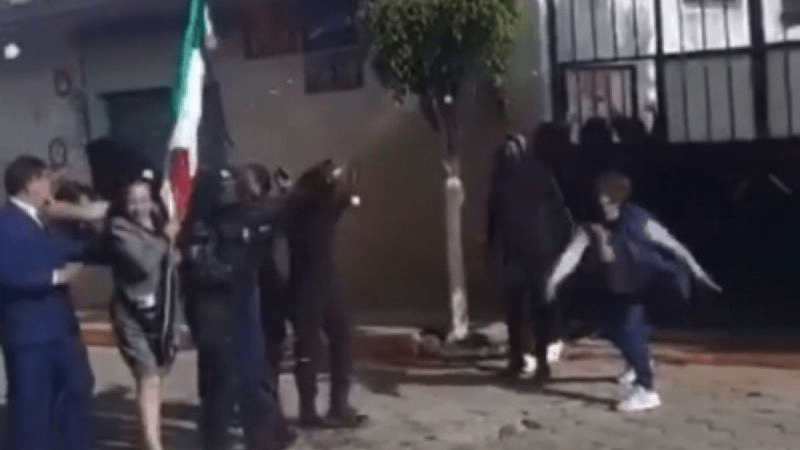 Un par de videos que circulan en redes sociales muestran el momento en que la alcaldesa, que forma parte de la escolta y porta la bandera de México, es agredida por un grupo de personas que sale de una vivienda.