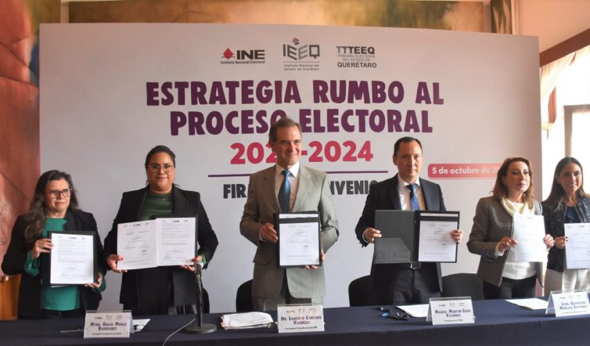 Querétaro, Qro., 5 de octubre de 2022.- El Instituto Electoral del Estado de Querétaro (IEEQ), el Instituto Nacional Electoral (INE) y el Tribunal Electoral del Estado de Querétaro (TEEQ) firmaron un convenio de colaboración y presentaron la Estrategia Rumbo al Proceso Electoral 2023-2024 en la entidad.