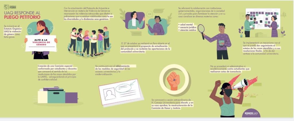 Querétaro, Qro., 17 de octubre de 2022.- La rectora de la UAQ, Teresa García Gasca, expresó en el noticiero Presencia Universitaria que las áreas competentes de la institución ya trabajan en responder a los planteamientos que los jóvenes en paro han expuesto públicamente, aunque aún no reciben el pliego petitorio final.