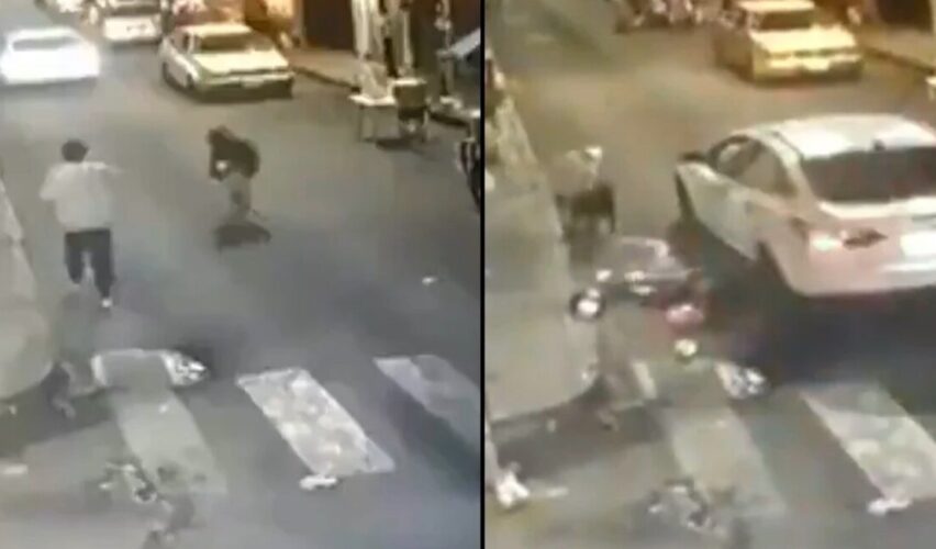 La mujer cae al piso y también sus cosas, mientras que el conductor permanece un momento en el sitio y luego acelera para escapar del lugar. Varias personas auxiliaron a la señora, quien pudo levantarse por su propio pie.
