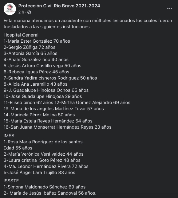 Protección Civil municipal publicó una lista de las personas lesionadas y a qué hospital fueron trasladadas para su atención. De las 23 víctimas, 16 se encuentran en el Hospital General, cinco en un nosocomio del IMSS y dos en el ISSSTE.