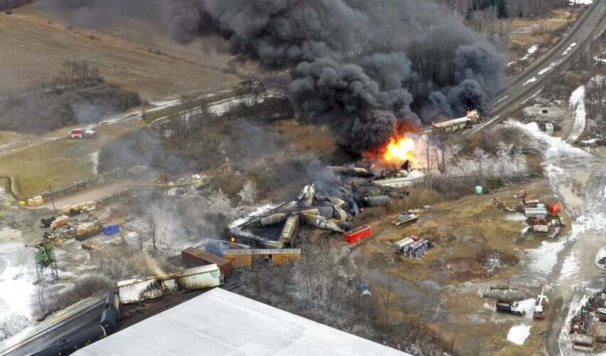 Autoridades ferroviarias prevén la liberación de cloruro de vinilo de los vagones aún en llamas en East Palestine, Ohio, cerca de la frontera con Pensilvania. La compañía ferroviaria Norfolk Southern advirtió que se podrían propagar vapores “mortales si se inhalan”.