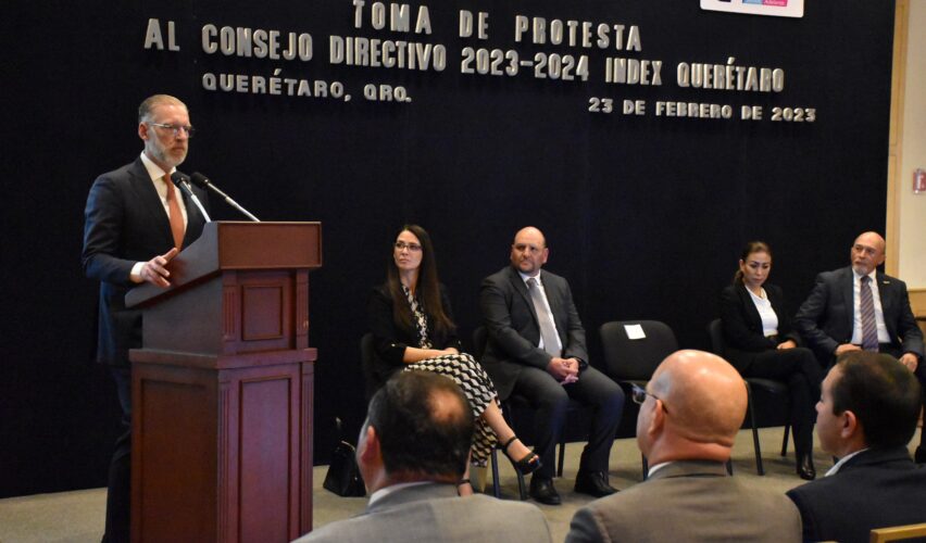 Querétaro, Qro., 23 de febrero de 2023.- Las exportaciones son un símbolo de competitividad, de crecimiento y de confianza porque los productos elaborados por las y los queretanos se están llevando a otros países, aseguró el titular de la Secretaría de Desarrollo Sustentable (Sedesu), Marco Antonio Del Prete Tercero, durante la toma de protesta al consejo directivo 2023-2024 de la Asociación de Industria de Exportación en Querétaro (Index).