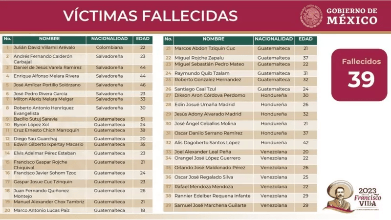 De las víctimas mortales, 18 eran de Guatemala, siete de El Salvador, siete de Venezuela, seis de Honduras y uno de Colombia, informó en conferencia de prensa la secretaria de Seguridad Pública y Protección Ciudadana, Rosa Icela Rodríguez.