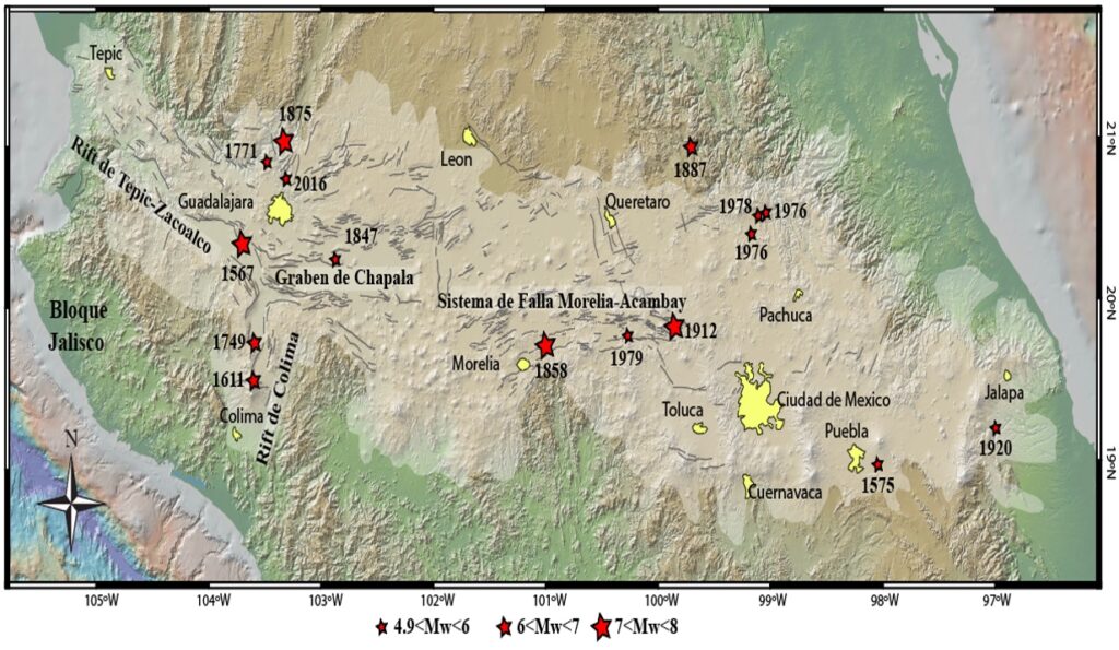 Fig. 1: Sismicidad histórica del Cinturón Volcánico Trans-Mexicano (modificado de Suárez y otros, 2019). La localización de los sismos históricos se representan por las estrellas rojas y las fallas corticales están representadas por las líneas negras.
