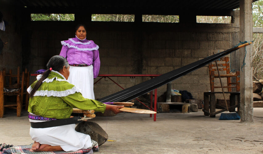 “Desde hace poco que estoy aprendiendo a usar el telar, aún me cuesta mucho trabajo y me equivoco; pero a mi cuñada —hija de Dominga— le es mucho más sencillo, aunque a ella le cuesta más bordar”, reconoce Hermelinda entre risas.