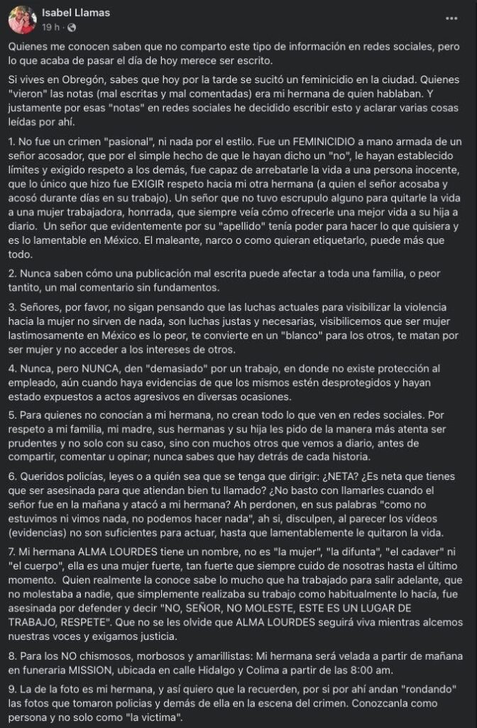 Isabel Llamas, hermana de Alma Lourdes, explicó ayer sábado en una publicación de Facebook que el asesino fue confrontado en la carnicería por acosar durante días a otra hermana de ambas. Asimismo, exigió respeto y justicia tras el crimen contra la joven.