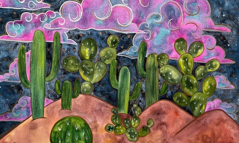 “Comencé a practicar, me gustó mucho la acuarela, visitaba los museos y los centros culturales, veía las exposiciones y nacía esta inquietud para querer exponer lo que yo pinto, que son básicamente tres temas: corazones con milagritos, ballenas y cactus, poco a poco encontré mi estilo”.