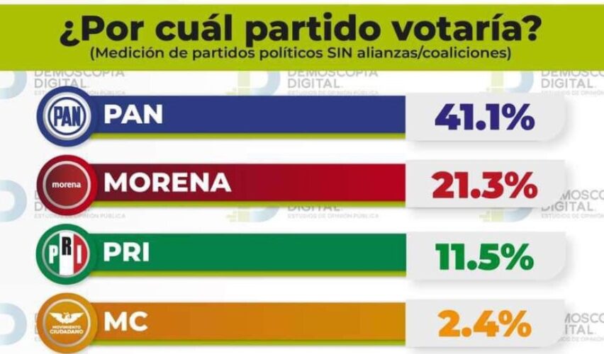 Morena alcanza una intención del voto del 21.3 por ciento, seguido por el Partido Revolucionario Institucional (PRI) con el 11.5 por ciento, Movimiento Ciudadano con el 2.4 por ciento, el Partido Verde Ecologista de México (PVEM) con el 2.2 por ciento, el Partido de la Revolución Democrática (PRD) con el 0.8 por ciento y el Partido del Trabajo (PT) con 0.5; la opción “otros” llega al 4.4 por ciento, y el 15.8 por ciento de los encuestados aún no sabe por quién votar.