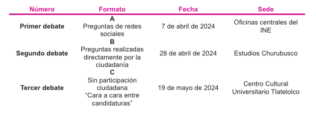 Con esta aprobación, apuntaron, el Instituto garantizará a la ciudadanía la posibilidad de conocer de primera mano los diagnósticos, las propuestas, los tiempos, las cualidades y habilidades políticas e intelectuales de las personas candidatas, ante los grandes desafíos del país. Además, aclararon que el INE no prohíbe, ni inhibe la realización de más debates; sin embargo, la ley obliga a dos y el Instituto realizará tres.