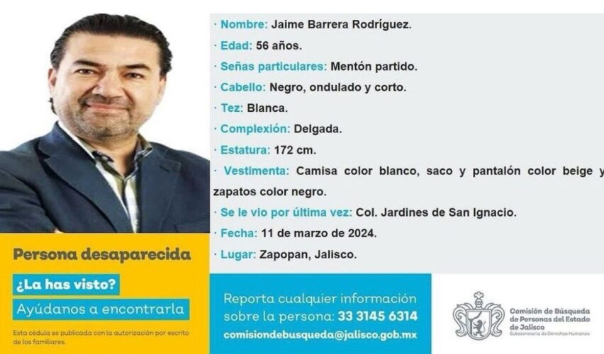 Su vehículo, una camioneta Fiat Fastback gris modelo 2024, fue hallado en la colonia Fovisste de Zapopan. Jaime Barrera acudió este lunes a su programa de radio, pero no se presentó al noticiero televisivo que conduce por la noche.