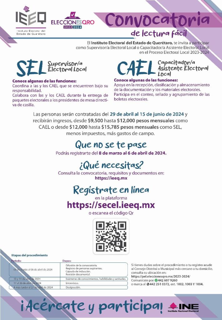 La ciudadanía interesada puede consultar la convocatoria completa en la página https://secel.ieeq.mx; solicitar informes al teléfono 442 251 0372, extensiones 1002, 1003 y 1004, o enviar un mensaje de WhatsApp al 442 607 9260.