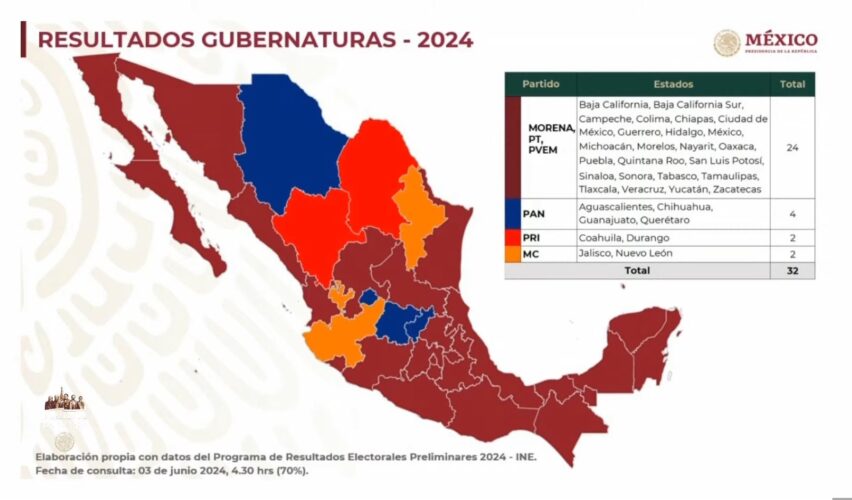 Con estos resultados, Morena gobernará en 24 estados, mientras que el PAN lo hará en cuatro, mientras que PRI y Movimiento Ciudadano lo harán en dos cada uno.