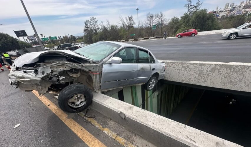 Querétaro, Qro., 25 de abril de 2025.- La tarde de este viernes, se registró un accidente vial sobre carriles de la carretera México-Querétaro, entre un tractocamión y un vehículo particular que quedó suspendido sobre los carriles del boulevard Bernardo Quintana.