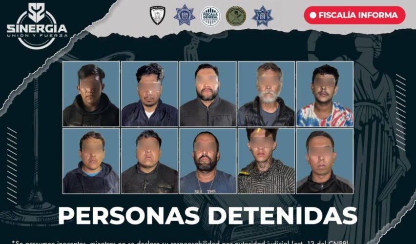 Querétaro, Qro., 12 de julio de 2025.- La Fiscalía General del Estado detuvo a diez personas y aseguró 48 vehículos relacionados con actividades ilícitas, tras cuatro cateos que se realizaron en los municipios de El Marqués y Corregidora, a partir de la investigación por homicidio calificado y delitos contra la salud.