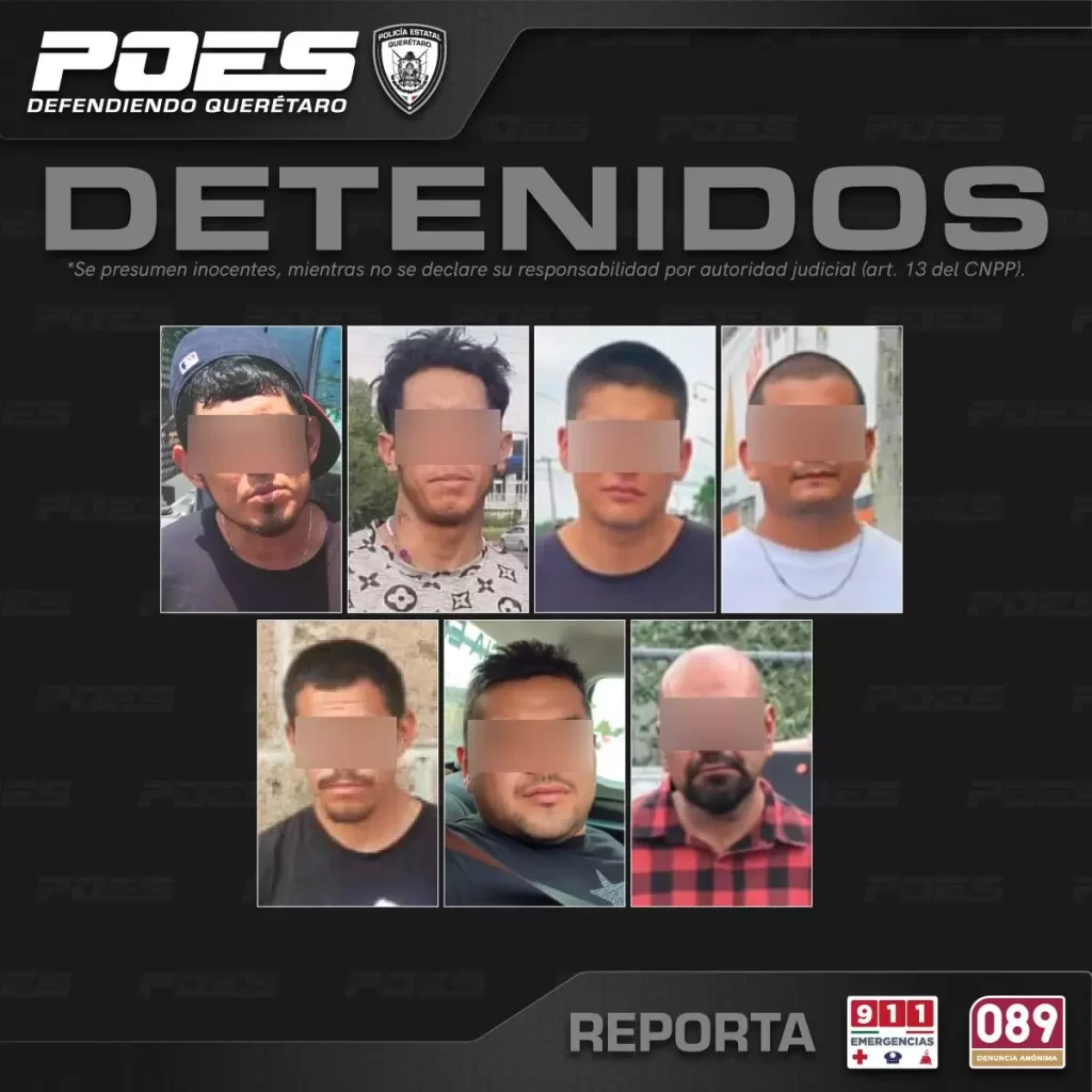 Querétaro, Qro., 25 de agosto de 2025.- La Policía Estatal de Querétaro dio a conocer que en intervenciones realizadas en los municipios de Querétaro, El Marqués y Jalpan de Serra se detuvo a siete personas presuntamente responsables de delitos contra la salud.