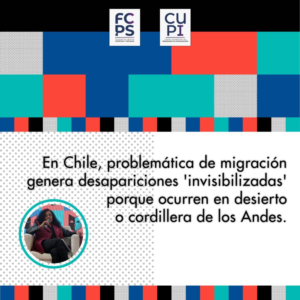 “Chile no percibía el fenómeno de la migración, no hay cifras”, advirtió al relatar que las desapariciones ocurren en el desierto (de Atacama), atraviesa la Cordillera (de Los Andes), y que son desapariciones ‘invisibilizadas’ porque no hay estadísticas de personas migrantes que se pierden al intentar alcanzar tierras chilenas.