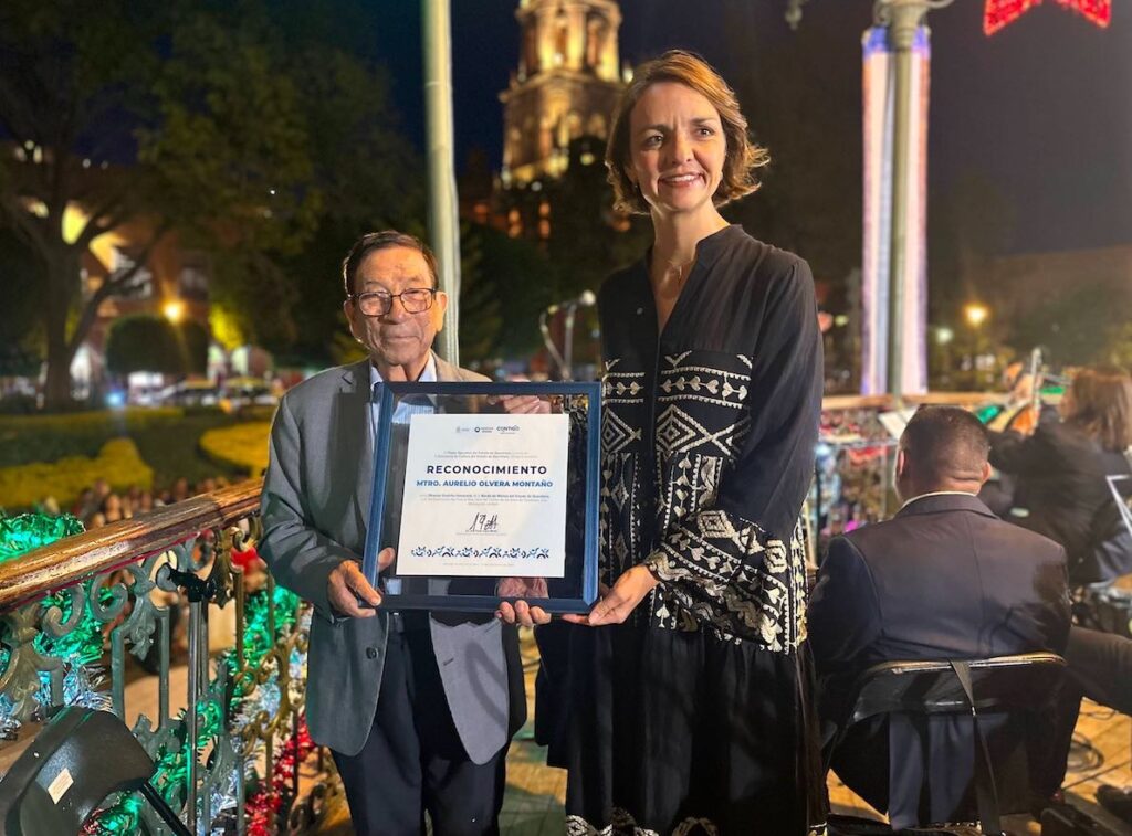 Durante la celebración, en el Jardín Zenea de la capital queretana, la funcionaria entregó al maestro Aurelio Olvera Montaño un reconocimiento como director emérito de la Banda de Música del Estado de Querétaro, la cual dirigió durante casi 54 años, de 1970 a 2024.