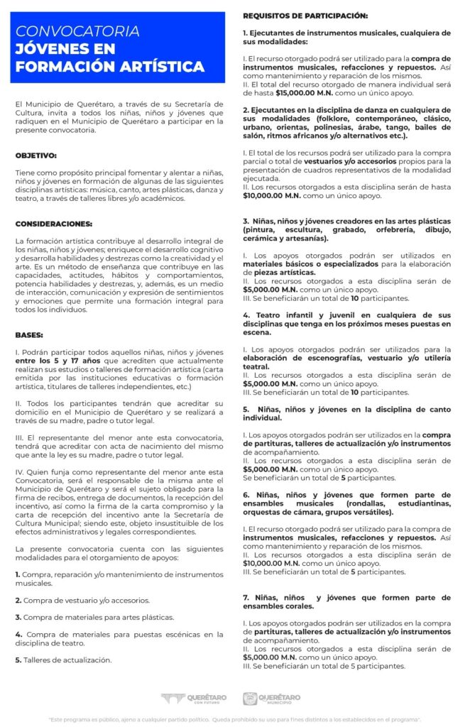 En esta convocatoria podrán participar niñas, niños y jóvenes de 5 a 17 años de edad, que acrediten que actualmente realizan sus estudios o talleres en formación artística (carta emitida por las instituciones educativas o formación artística, titulares de talleres independientes, etc.); además se pedirá a quien funja como representante del menor ser responsable ante el municipio y sujeto obligado para firmar recibos, entrega de documentos, recepción del incentivo, así como firma de carta compromiso, y la carta recepción del incentivo ante la Secretaría de Cultura del Municipio, al ser este sujeto insustituible de los efectos administrativos legales correspondientes.