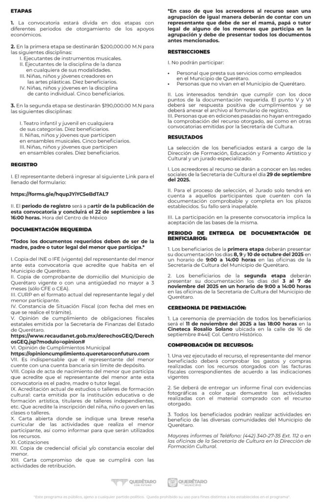 Todas las bases, restricciones y documentación requerida de la siguiente convocatoria puede consultarse través de las redes sociales de la Secretaría de Cultura del Municipio de Querétaro, o en el siguiente enlace: https://forms.gle/EwyoCnt6umVN4yvd9. Es importante que se lea detalladamente la documentación requerida, las restricciones, así como los tiempos de registro, resultados, entrega de documentación y día de la ceremonia de premiación.