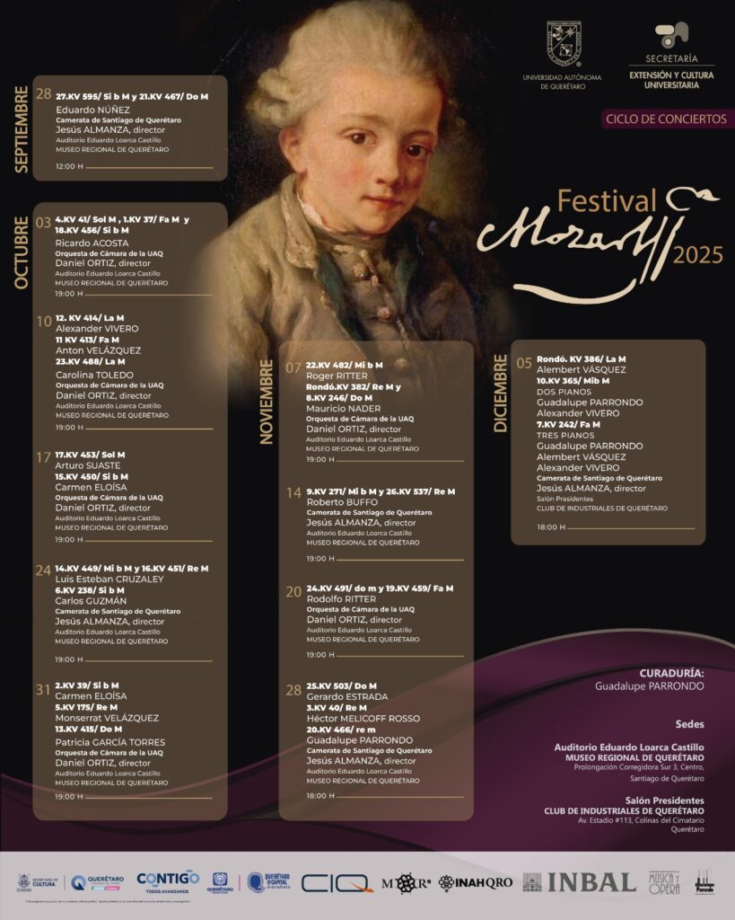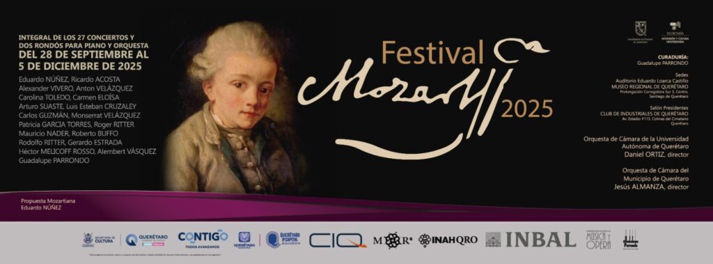 Querétaro, Qro., 27 de septiembre de 2025.- Por primera vez en América Latina se interpretarán en un solo ciclo, los 27 conciertos para piano y orquesta que compuso Wolfgang Amadeus Mozart, todos de manera gratuita y con 19 pianistas, que alternarán con concertistas de amplio reconocimiento, como Mauricio Nader, Rodolfo Ritter, Carmen Eloísa, Roberto Buffo y Guadalupe Parrondo, también responsable de la curaduría del Festival Mozart 2025.