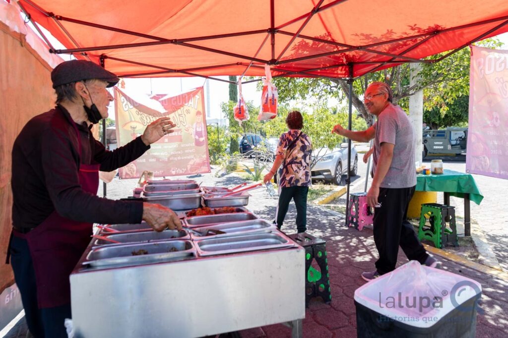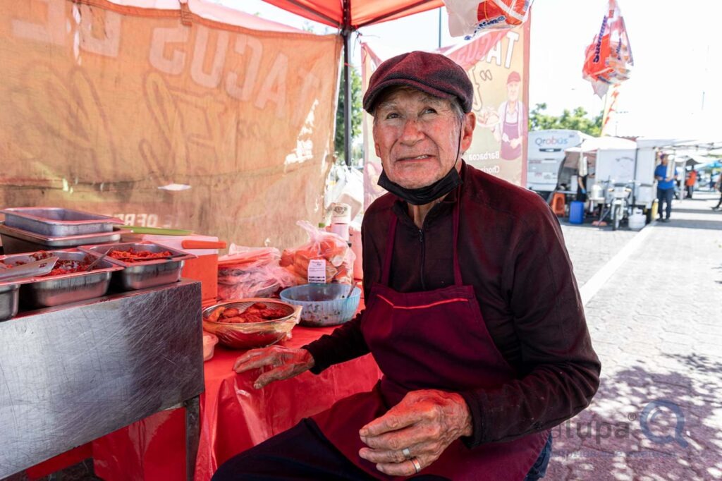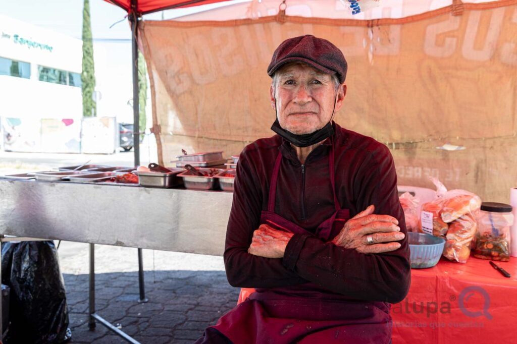 A sus 85 años, Gabino vende tacos con guisados que prepara a las 5 de la mañana para llegar a su puesto antes de las 9. El ex jugador de Gallos Blancos fue chef en Estados Unidos durante 18 años y regresó a Querétaro para acompañar a su esposa enferma de cáncer. Desde que le robaron su auto, gasta 240 pesos por día para transportar su carrito y materiales, en espera de que avance una recaudación que se inició a través de redes sociales para comprar otro coche usado.