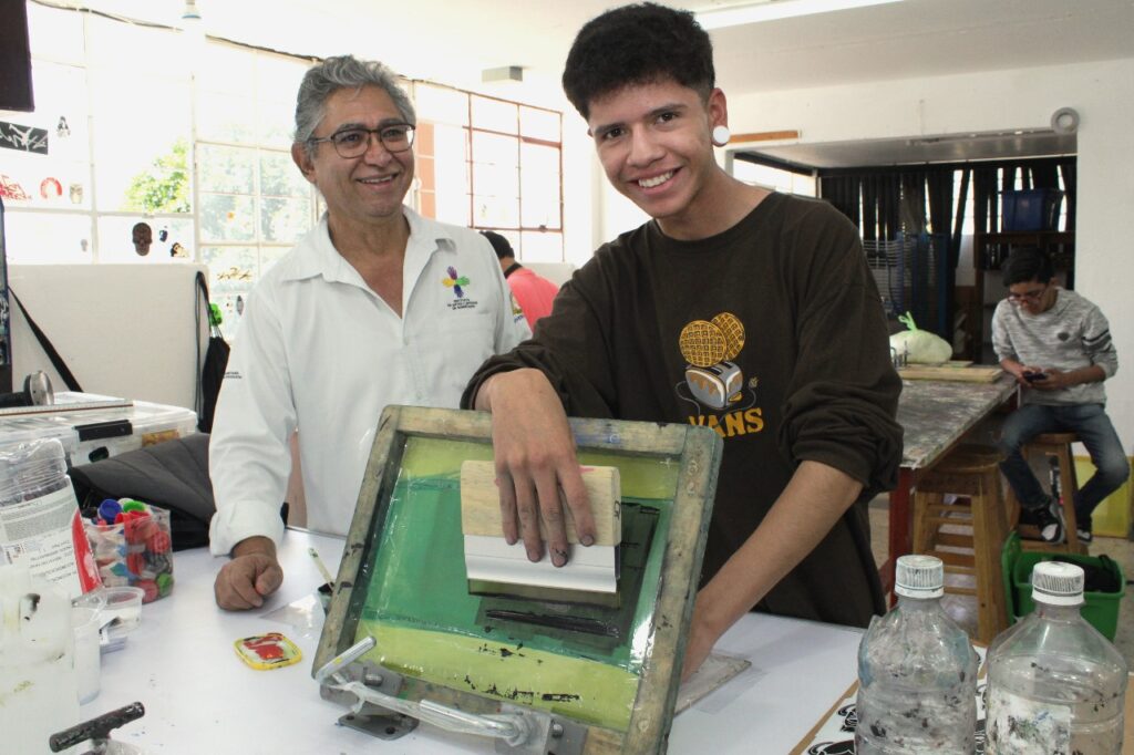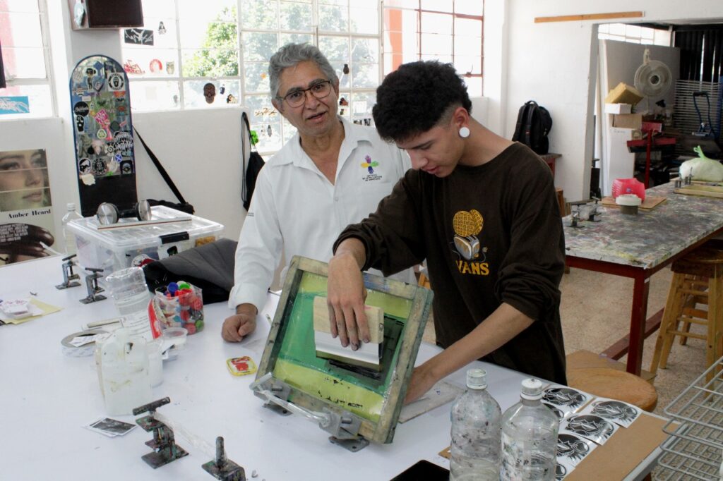 El maestro Rodríguez explica que el taller inicia con prácticas sencillas, con una sola tinta y van subiendo de dificultad, incorporando más tintas y técnicas. Además, a partir del segundo semestre, los alumnos incorporan el diseño por computadora, para enriquecer la impresión digital con la serigrafía.
