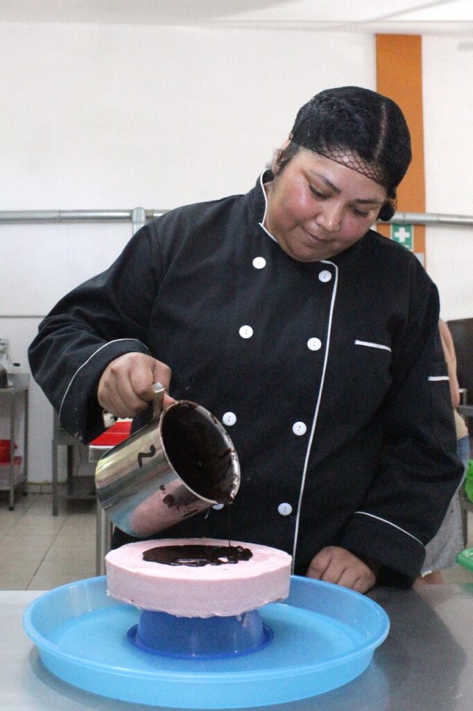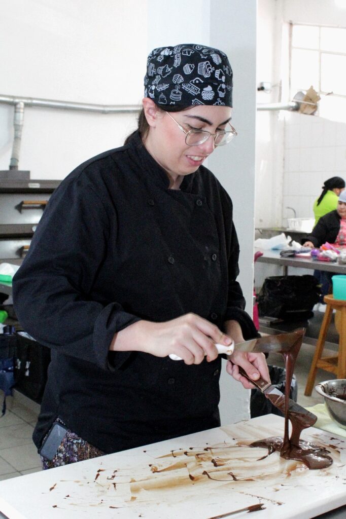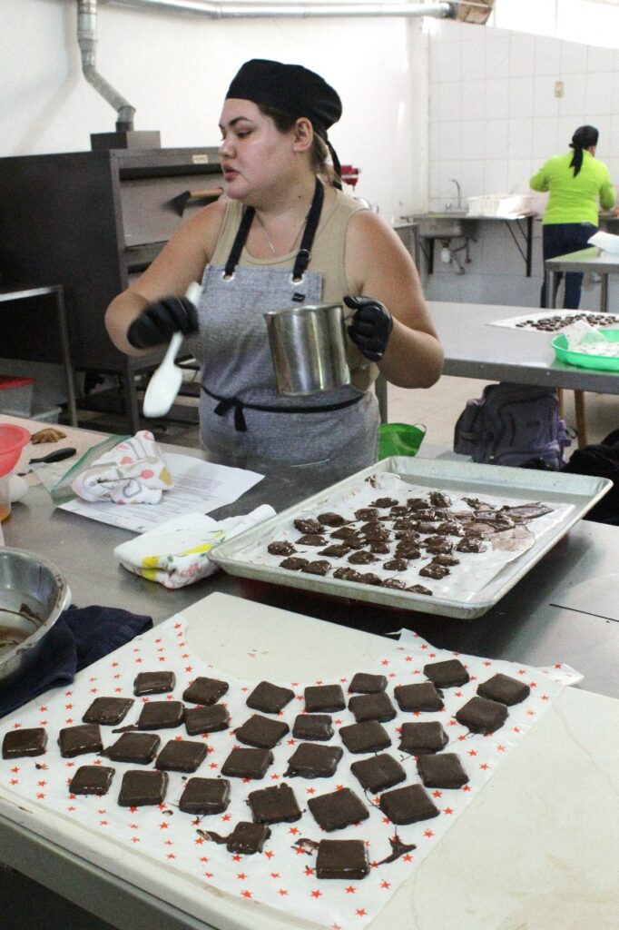 En el salón contiguo a la cocina, el aire se endulza con el aroma a azúcar y suenan las espátulas chocar al revolver el chocolate. Shaden Alonso, alumna del segundo semestre, se esmera en moverse con velocidad y precisión, para tener el chocolate en su punto exacto.
