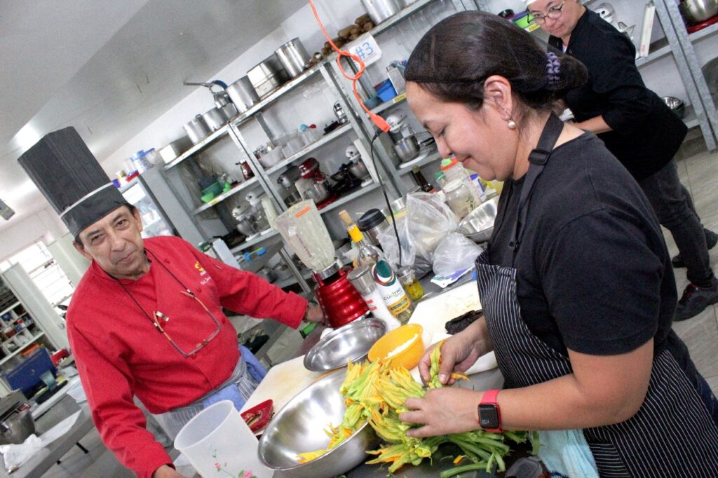 Lejos de las tintas y los olores estridentes, se encuentra el taller de alta cocina, impartido por el chef Jorge Ochoa. Dentro de su aula, cerca de una decena de personas pelan, baten, muelen, capean, sazonan con un objetivo en común: preparar pescado a la veracruzana, crema de flor de calabaza y garapiñados.