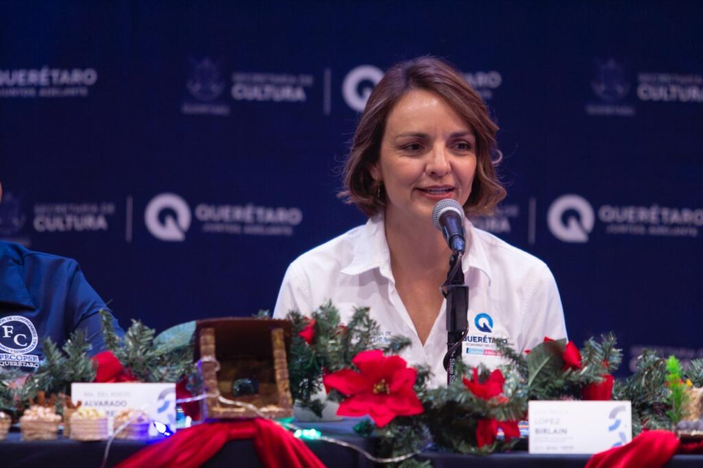 Querétaro, Qro., 19 de noviembre de 2025.- La secretaria de Cultura del estado, Ana Paola López Birlain, presentó la programación Ahí viene la Navidad, integrada por actividades de temporada. Comentó que del 21 al 23 de noviembre se llevará a cabo en el CEART el Mercadito Navideño, organizado por la Federación de Comerciantes, Locatarios Establecidos y Prestadores de Servicios (FECOPSE), donde se ofrecerán nacimientos, portales, nochebuenas, piñatas, luces, esferas, árboles, coronas, listones, adornos y gastronomía para toda la familia.