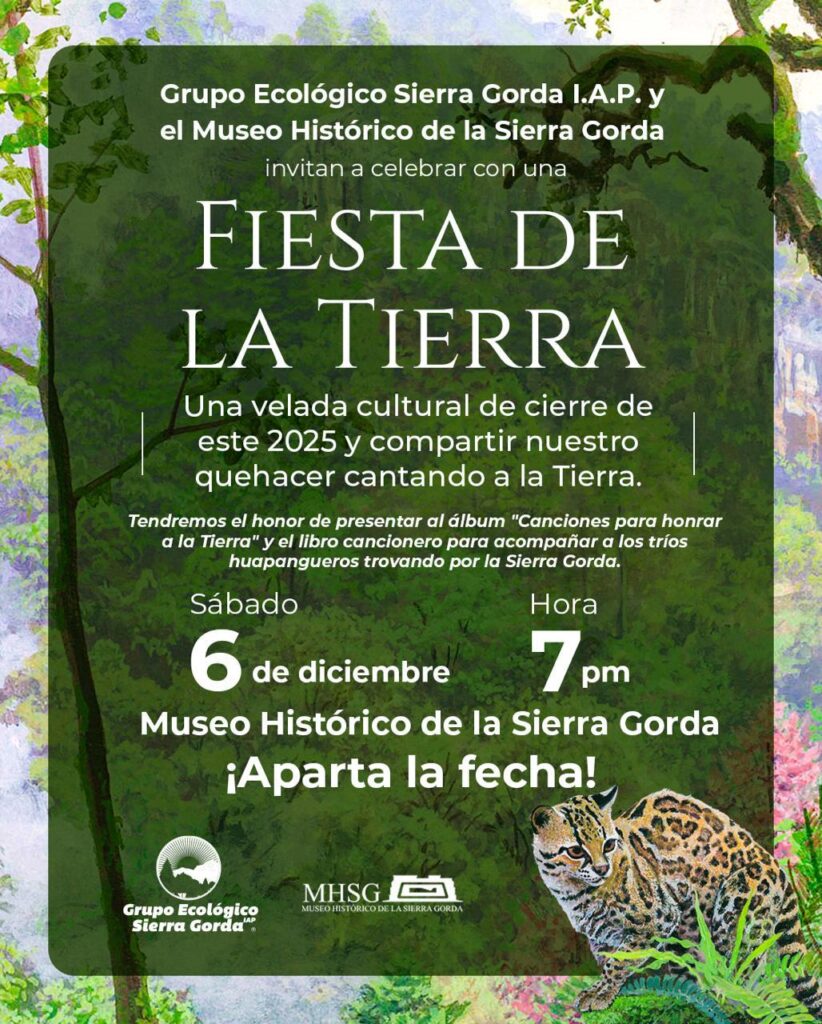Querétaro, Qro., 2 de diciembre de 2025.- El próximo 6 de diciembre, Martha “Pati” Ruiz Corzo, fundadora y directora general de Grupo Ecológico Sierra Gorda I.A.P. (GESG) y su equipo, presentarán en el Museo Histórico de la Sierra Gorda, en Jalpan de Serra, una hermosa colección musical de 16 tracks de huapango y balada, de 45 minutos en total.