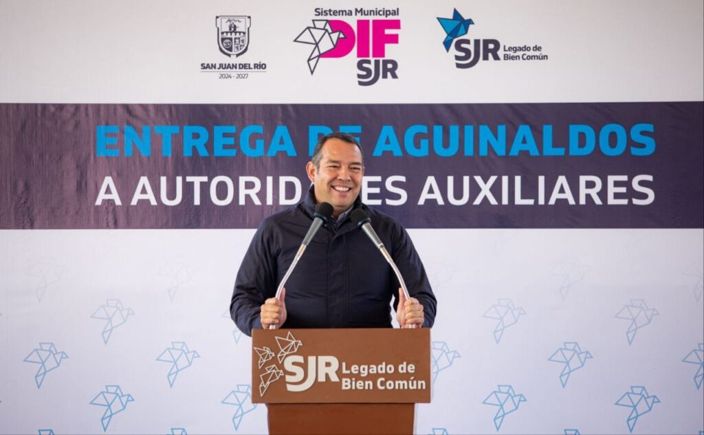 San Juan del Río, Qro., 11 de diciembre de 2025.- Con la finalidad de brindar acompañamiento a la sociedad sanjuanense, expresarle un reconocimiento institucional, cariño y poner de manifiesto los motivos para sentirse cercanos y apoyados por las autoridades municipales, la presidenta del Sistema Municipal para el Desarrollo Integral de la Familia (DIF) de San Juan del Río, Gina Sánchez Barrios, y el alcalde, Roberto Cabrera Valencia, encabezaron la entrega de más de 26 mil aguinaldos a autoridades auxiliares.